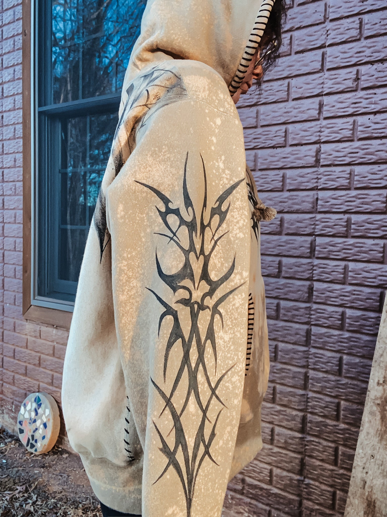This hoodie was made using bleach, fabric paint, and thread. I wanted the main focus of this hoodie to be all about symmetry. The material is extremely cozy and amazing quality.
